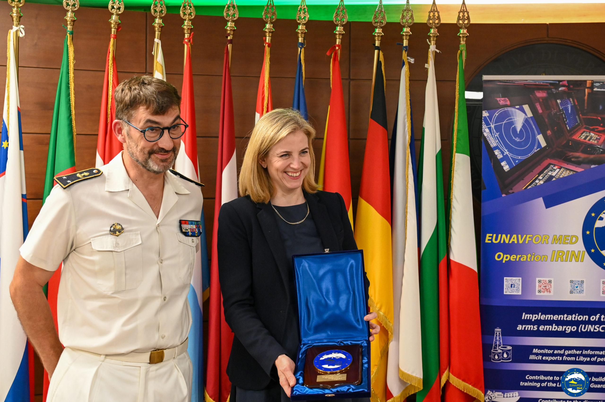 At the start of the visit, Minister MEINL-REISINGER greeted representatives from the 23 EU Member States contributing to Operation IRINI, expressing her appreciation for their strong commitment and notable achievements.